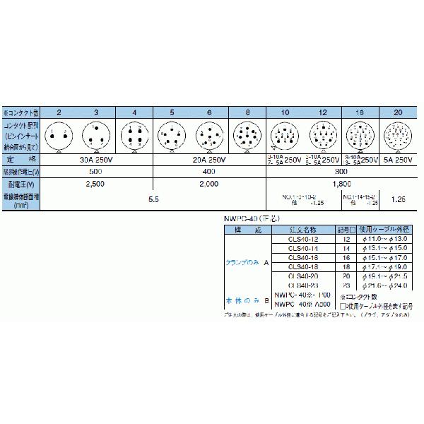 | 材料/素材 | NWPCシリーズ結合時に防水機能を有するように設計されたコネクタケーブル引き出し部分は、ゴムパッキン、ケーブルクランプとで二重にケーブルを保持する構造広範囲の用途を対象に10種のシェルサイズと多数のコンタクト数を用意 | ||