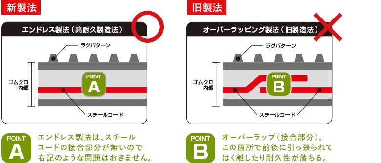 | 材料/素材 | 【注文時の確認事項】●注文時に下記6項目をお知らせください。1. メーカー2. 機種・型式3. 製造番号(シリアルナンバー)4. 発送や納期についてご連絡する際に、すぐに連絡のつく電話番号●配送時に「会社名・屋号」が必要な場合があります。※適合がわからないお客様は当店まで一度お問い合わせください!TEL:080-9637-7358(パーツマンヤフー店直通番号)【配送に関してのお願い】荷卸しの際にフォークリフトがない場合、お手伝いを頂くことがございます。そのため、こちらよりお電話をさせて頂きますので、日中ご連絡がとれる番号をご記入ください(携帯など)。連絡が付かない場合は、発送ができませんのでご了承ください。当店の商品は保証内容が明確だから安心商品の品質には絶対の自信があります。だから販売日より最長1年間の保証付き。当店のゴムクローラーは保証内容が明確なので安心です。使用機械やゴムの種類により保証内容が異なりますのでご不明な点がございましたらお尋ね下さいませ。高耐久を実現したエンドレス製法当店のゴムクローラーは高耐久・長寿命を実現した新構造のエンドレスワイヤー製法にて製造されております。エンドレス製法はスチールコードの接合部分が無いので、ワイヤーの接合はく離の心配はいりません。この製法は専門の技術が必要であり、尚且つ製作の工程数が増える為、ゴムクローラー自体の製造時間も増えてしまいます。 当然ながら製造原価自体も高くなってしまいますが、当店では大切なお客様に安心して使用して頂こうという観点から東日興産製ゴムクローラーを販売しております。ソフトで装着しやすい最高級ゴムを使用●お使いのゴムクローラーの内側に打刻されているサイズ(幅×ピッチ×コマ数)をご確認お願いします。●ゴムメーカーによって、ピッチとコマ数の表記順などが異なる場合もございます。また、打刻がクローラーサイズでは無く純正品番の場合もあります。当店にて適合確認を行いますので、可能な限りの刻印情報をお教え下さいませ。●打刻が無い場合は実測サイズに測定をお願いします。建設機械用ゴムクローラーのサイズ確認について社外品ゴムクローラーを装着しようと思ったら、硬くて装着するのが大変だったということはありませんか?当店のゴムクローラーは技術改良を行った最高級のゴムを使用しているため、よりソフトで装着しやすいゴムクローラーの提供を実現しました。さらに、水や油に強い処理加工を盛り込んでいる為、他社製に比べて耐久性や寿命に大幅な差が出ています。ゴムは水や油には非常にデリケートですので、当店のゴムクローラーはパワフル且つ長期間、安心してご使用いただけます。 | ||