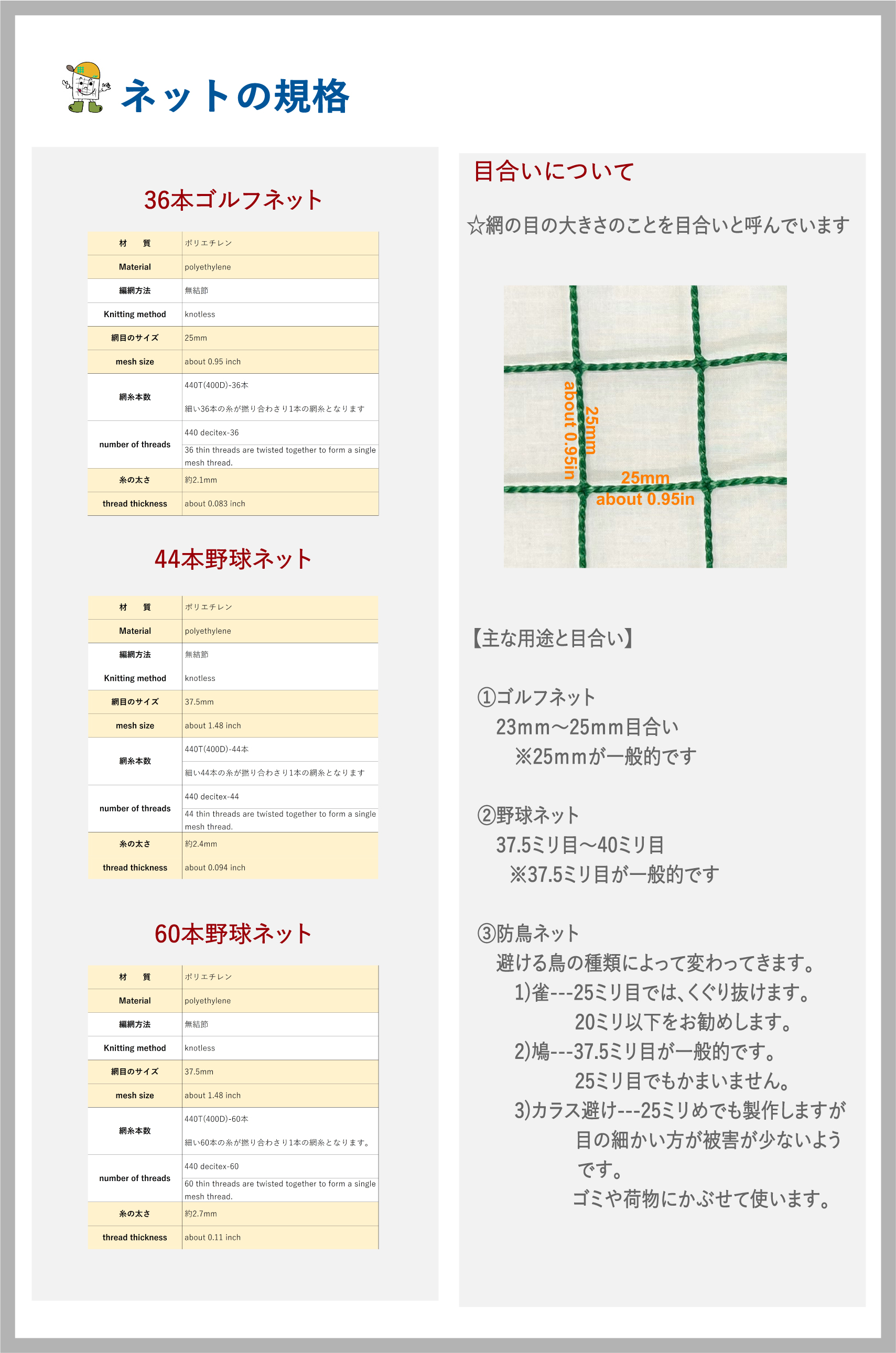 | 材料/素材 | 細かい寸法設定でご注文いただけます。縦は0.1m〜1mまで10cm刻みで、横は0.1m〜30mまで10cm刻みでご注文いただけます。 別注寸法での製作をご希望の場合は、お問い合わせください。カラーも豊富に取り揃えております。 | ||